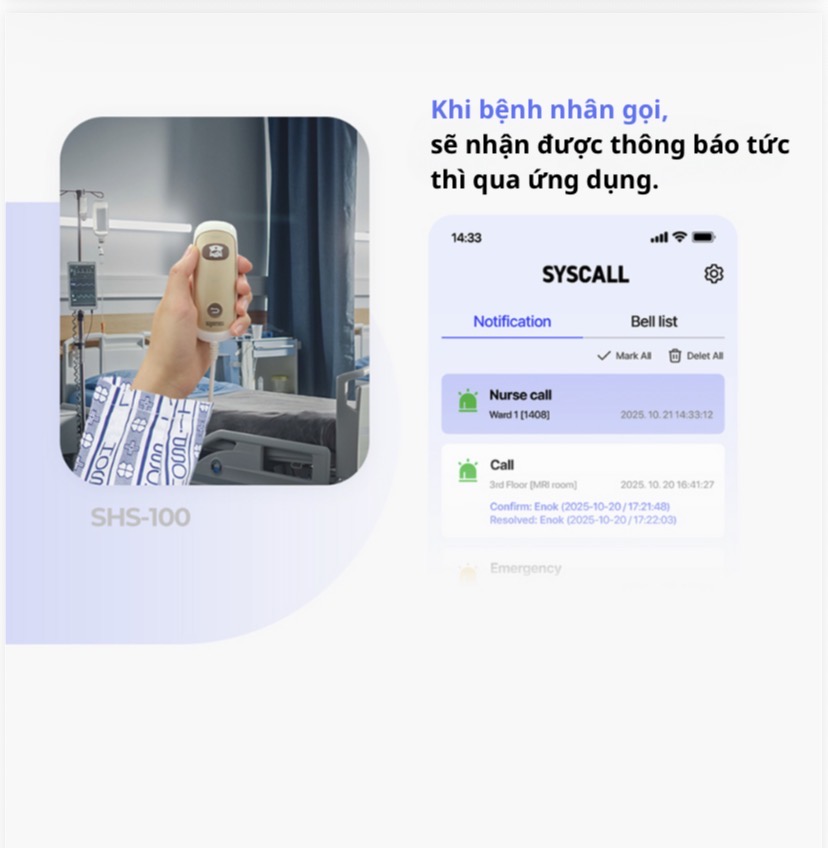 Quản lý gọi y tá, khẩn cấp, và theo dõi thời gian phản hồi chính xác.